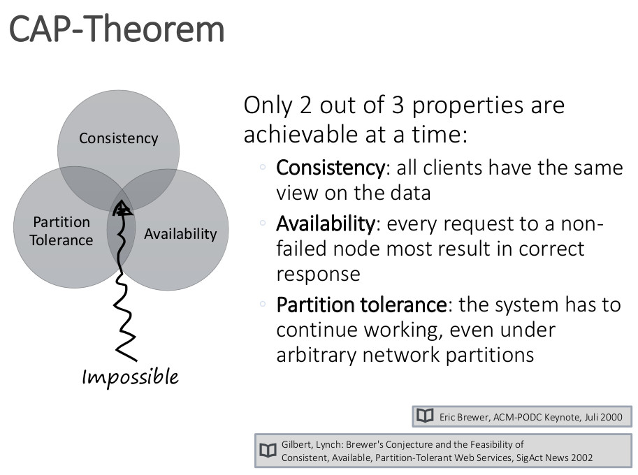 El teorema indica que los sistemas de datos distribuidos ofrecerán un equilibrio entre consistencia, disponibilidad y tolerancia a particiones. Además, cualquier almacén de datos solo puede garantizar dos de las tres propiedades:
