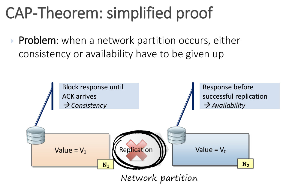 Podemos observarlo en la figura anterior, donde cuando se produce una partición de red, se debe renunciar a la coherencia o a la disponibilidad. Para la consistencia, se bloquea la respuesta hasta que llegue ACK, sin embargo, para la disponibilidad, la respuesta se da antes de que la replicación sea exitosa.