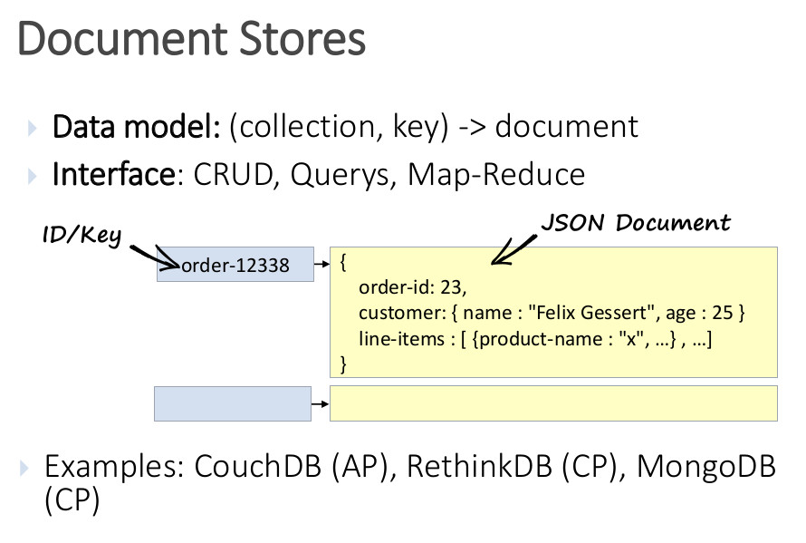 Estas bases de datos almacenan datos autocontenidos llamados documentos. Cada documento puede definir su propio esquema. Estos documentos generalmente tienen formato JSON (aunque también existen otros como YAML o BSON, o incluso como un fichero de texto). Asignan a cada documento un identificador único y no es necesario definir relaciones entre ellos.