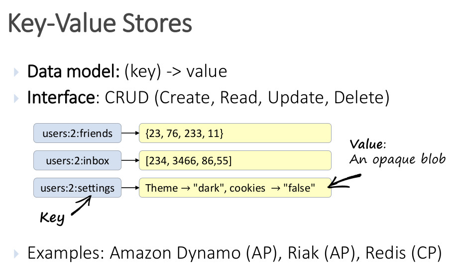 Estas bases de datos tampoco tienen un esquema de datos predefinido. Se asimilan al concepto de array o map persistente y a las bases de datos con dos columnas, la primera es la clave y la segunda el valor del registro. Los valores pueden tomar el tipo de dato que sea necesario, incluso JSON.