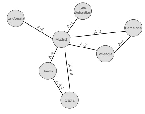 Donde V representa el conjunto de nodos o vértices y E representa el conjunto de enlaces o aristas. Así pues, sea el grafo de la figura 1.19 que representa un conjunto de ciudades conectadas por autovías, el conjunto V de nodos sería V = {La Coruña, Madrid, San Sebastián, Barcelona, Valencia, Sevilla, Cádiz}, mientras que el conjunto de enlaces E vendría dado por