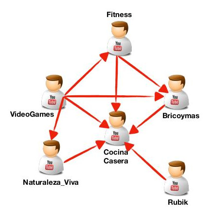 Aunque existen diferentes tipos de modelos de datos basados en grafos, cada sistema de base de datos elegirá uno de ellos para representar el contenido de la base de datos. Cualquiera de estos modelos está inspirado en la estructura matemática de un grafo para modelizar un conjunto de datos. Matemáticamente, un grafo es un conjunto de nodos o vértices, que representan entidades de un dominio, y un conjunto de aristas o enlaces, que representan las relaciones o interacciones que se producen entre las entidades. La figura1.20 muestra un ejemplo de grafo que representa las relaciones de seguimiento entre distintos canales en YouTube.