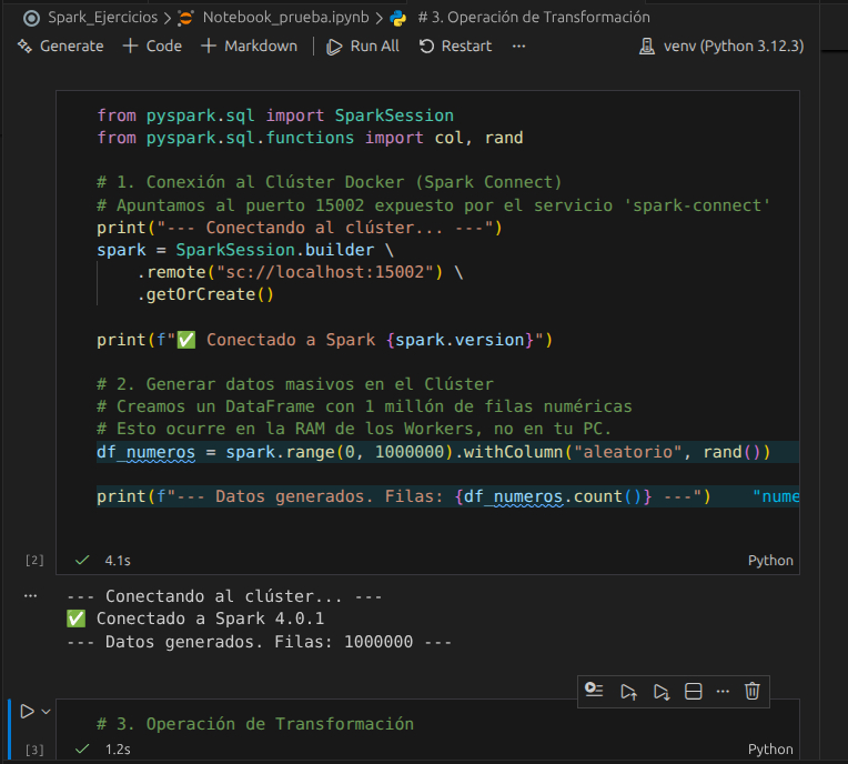 Ya puedes crear celdas y ejecutar PySpark en VS Code conectado a tu clúster Docker.